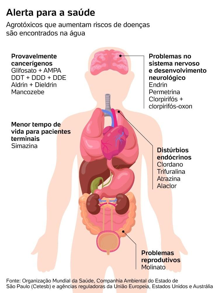 O consumo de água com altas concentrações de agrotóxicos aumenta os riscos para doenças crônicas, como câncer e distúrbios hormonais, e para problemas no sistema nervoso, nos rins e no fígado, explica Fábio Kummrow, professor de toxicologia da Universidade Federal de São Paulo (Unifesp).